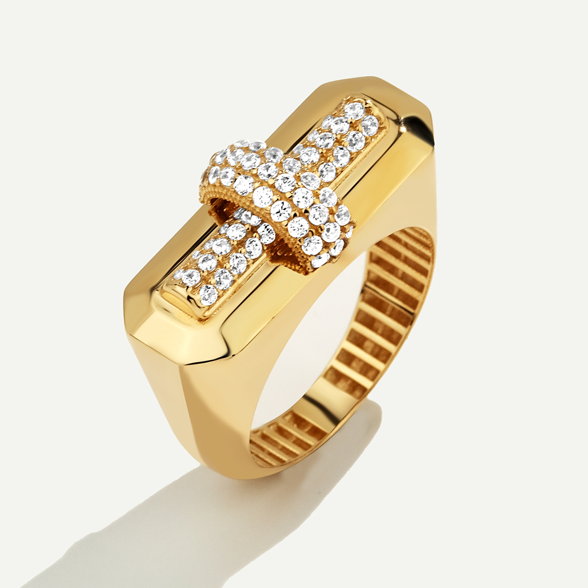 14 Ayar Altın Üzeri Taşlı Yüzük, ortasında yer alan dikey taşlı şerit tasarımıyla modern bir görünüm sunar. İddialı detaylarıyla şıklığınızı tamamlar.